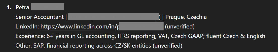 That last requirement is the one that makes this hard. Czech and English fluency in a finance role, in Prague specifically, narrows the pool considerably. Most candidates who fit that profile are not posting about themselves in English. Many of them are not active on LinkedIn at all. This is exactly the kind of search where Boolean strings fail and where a more creative approach starts to pay off.