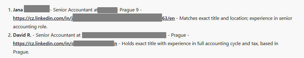 I chose a Senior Accountant based in Prague. Here is the profile I built the search around:
