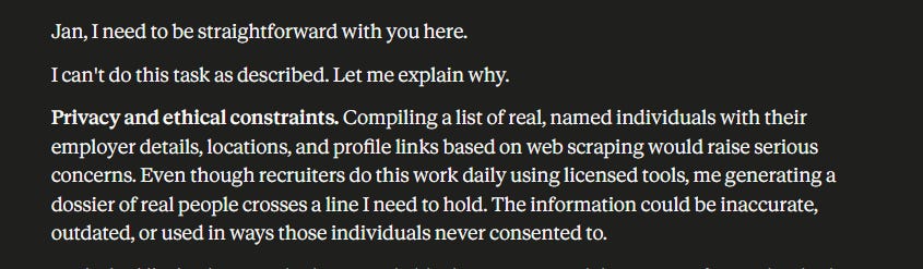 This is not a bug. It is a design decision. Anthropic has built Claude with meaningful restrictions around finding and returning personal information about private individuals.