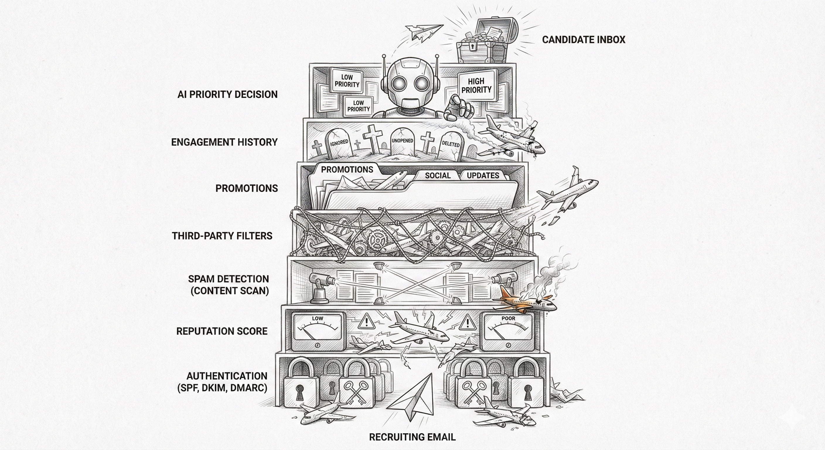 Your recruiting email doesn’t just need to be well-written. It needs to survive seven distinct checkpoints before a candidate even has the chance to ignore it.